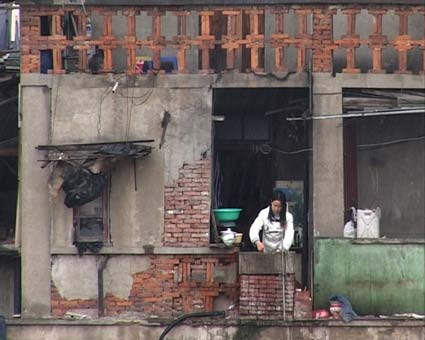 "Shanghai Shanghai" "Shanghai Shanghai" is a montage of virtual images touting the development program to developers and tourists and presenting the city as it will be when building is finished, with images of the construction sites taken by the artist himself, showing how whole neighborhoods are being destroyed as their inhabitants are expelled, and sometimes even before they get out! We see a woman busy in her kitchen with, on one side, a blank space where the wall used to be... "SHANGHAIEXPRESS" A video shot all day from the 56th floor of a homebuilding. A look at Shanghai harbour's hive of activity.
